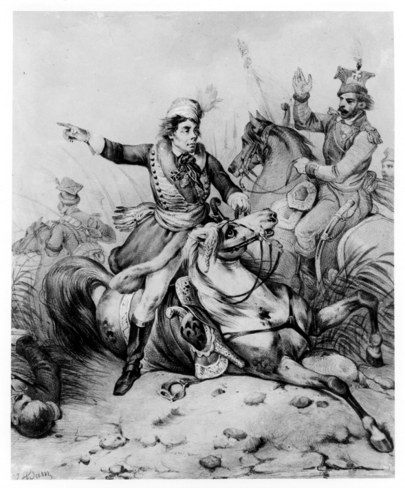 Rycina przedstawia żołnierzy na koniach. Jeden z nich powalony na ziemi. Siedzi na nim mężczyzna,  który wyciąga prawą rękę i wskazuje w lewą stronę. Obok niego żołnierz na koniu. W tle rozgrywa się bitwa. Jest to scena z bitwy pod Maciejowicami, rycina Victora Adama.