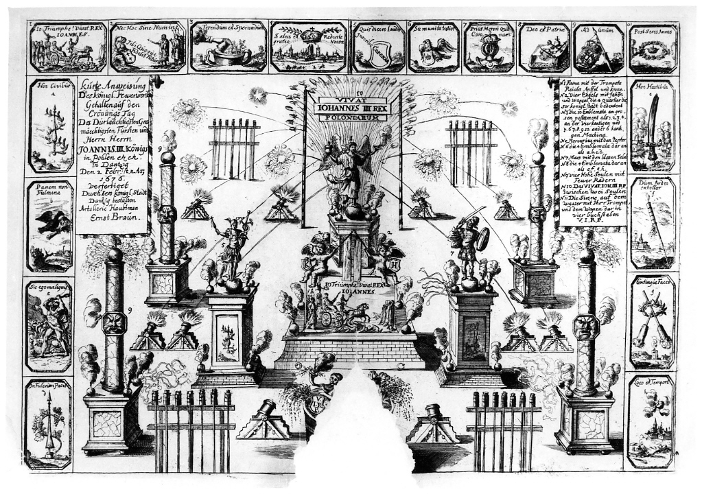 Grafika ilustruje fajerwerki w Gdańsku z okazji koronacji Jana III Sobieskiego. Na środku kompozycji pomnik z aniołem i puttami. Po bokach dwa cokoły z pomnikami rycerzy. Na zewnątrz cztery kolumny. Naokoło kompozycji małe obrazki z ilustracjami oraz teksty.