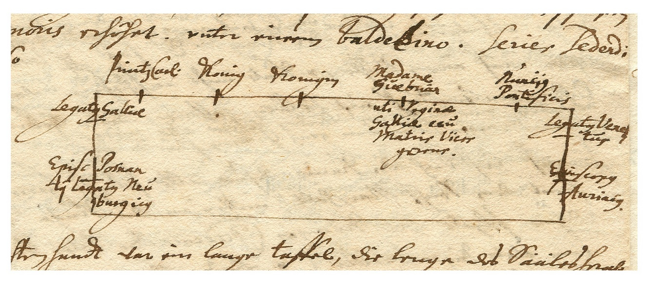 W Archiwum Głównym Akt Dawnych znajduje się dokument (ASK 1, Rachunki Królewskie 380, k. 146-150) z początku lat 90-tych XVI w. pt. Stoły na bankiecie Króla Jego Mości, opisujący ze szczegółami kolejność zasiadania biesiadników. Pierwszy stół „królewski” postawiono pośrodku izby dla króla, Anny Jagiellonki, królewny Anny Wazówny, kardynała Radziwiłła, nuncjusza oraz 2 posłów cesarskich. „Po lewej ku Wiśle” posadzono ok. 40 panów senatorów, z prymasem i kasztelanem krakowskim na czele. Trzeci stół, po prawej („ku podwórzu”) przeznaczono dla niewiast, przede wszystkim małżonek senatorskich, żon podczaszego, kuchmistrza, krajczego, koniuszyny, podstoliny, wreszcie pań z fraucymeru Anny Jagiellonki i Anny Wazównej (ok. 40 osób). Czwarty stół zarezerwowano dla „poselskich szlachciców i paniąt polskich” (ok. 30 osób) – referendarzy, starostów, podkomorzych, etc. W czasie imprezy tego typu zawsze istniał stół dla „urzędników, którzy urząd czynią” – np. marszałka, kanclerza, podskarbiego koronnego i nadwornego. Dokument wskazuje kolejność posługi oraz przypisuje najważniejszym statystom poszczególnych urzędników. Kto inny miał „służyć przy stole”, kto inny podawać wodę, kto inny „przed misą chodzić, nosić misę i półmiski do stołu”, kto inny wreszcie zajmować się ręcznikiem, miednicą, nalewką, etc.