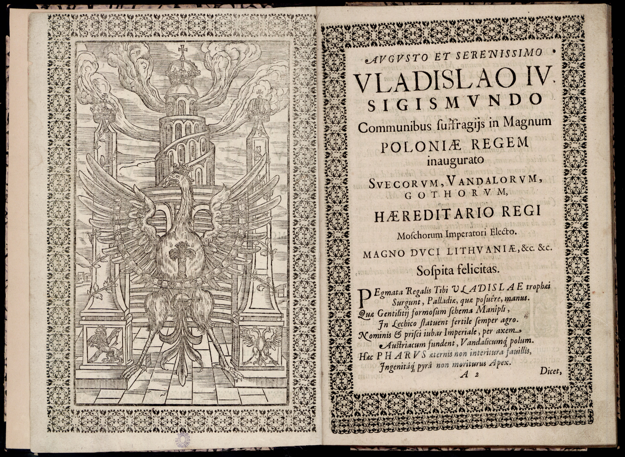 Wybór Władysława na króla polskiego przyniósł szereg utworów panegirycznych, wydawanych w kraju, jak i poza jego granicami. Dla Władysława IV łaciński panegiryk napisał jezuita Bartosz Paprocki. Wydana w roku 1633 Pharus Sarmatica (Sarmacka latarnia) była utworem, w którym proza przeplatała się z fragmentami wierszowanymi. Dzieło podzielone zostało na części, z których każda poprzedzona była ryciną. Obok pojawiającej się na kilku z nich latarni często występował na nich orzeł. Część zatytułowana „Latarnia radości i miłości” zawierała dodatkowo jeszcze siedem alegorycznych rycin. Objęcie tronu przez nowego monarchę wysławiali również krótkimi wierszami scholarzy Akademii Krakowskiej. Z 1633 roku pochodzi zbiór Felix omen serenissimo ac potentissimo Vladislao IV (Szczęśliwy znak dla najjaśniejszego i najmożniejszego Władysława IV) napisany pod kierunkiem Jana Cynerskiego-Rachtamowicza. Książka ta oprócz wiersza Cynerskiego-Rachtamowicza zawierała kilka innych pomniejszych utworów.