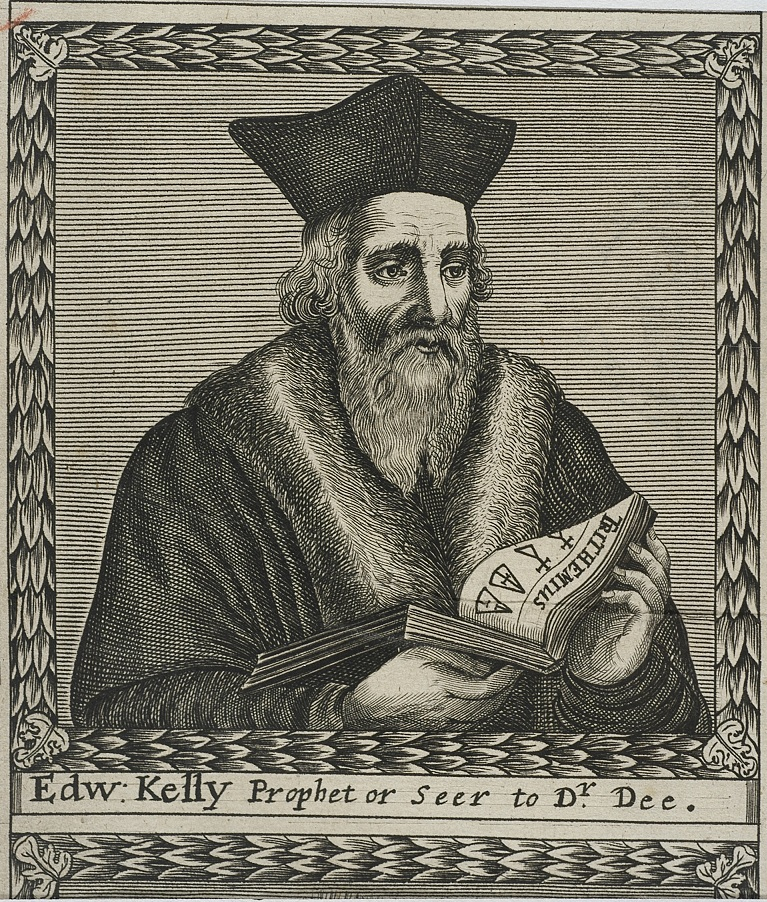 O ile jednak Dee pozostał w głębi duszy uczonym i uczciwym poszukiwaczem prawdy, to jego pomocnik Edward Kelley (1555 – 1595), aptekarz–alchemik, był typowym spryciarzem i oszustem, „złym duchem” maga, postacią co najmniej podejrzaną. Naprawdę nazywał się Talbot. Przyłapany na fałszowaniu aktów notarialnych, został skazany na obcięcie uszu. Włócząc się po Anglii i żebrząc pod przybranym nazwiskiem miał na tyle tupetu, aby wkraść się w zaufaniu i łaski Johna Dee. Odtąd stał się młodym uczonym i asystentem mistrza.