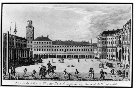 Pejzaż miejski. Duży plac otoczony rzędem budowli. Horyzontalnie architektura z arkadami i podcieniami. Po lewej stronie wieża i pałac z kolumnadą. Po prawe stronie wysokie monumentalne budynki. Na placu obelisk. Wszędzie ludzie, gdzieniegdzie dorożki z końmi. Jest to miasto Marywil.