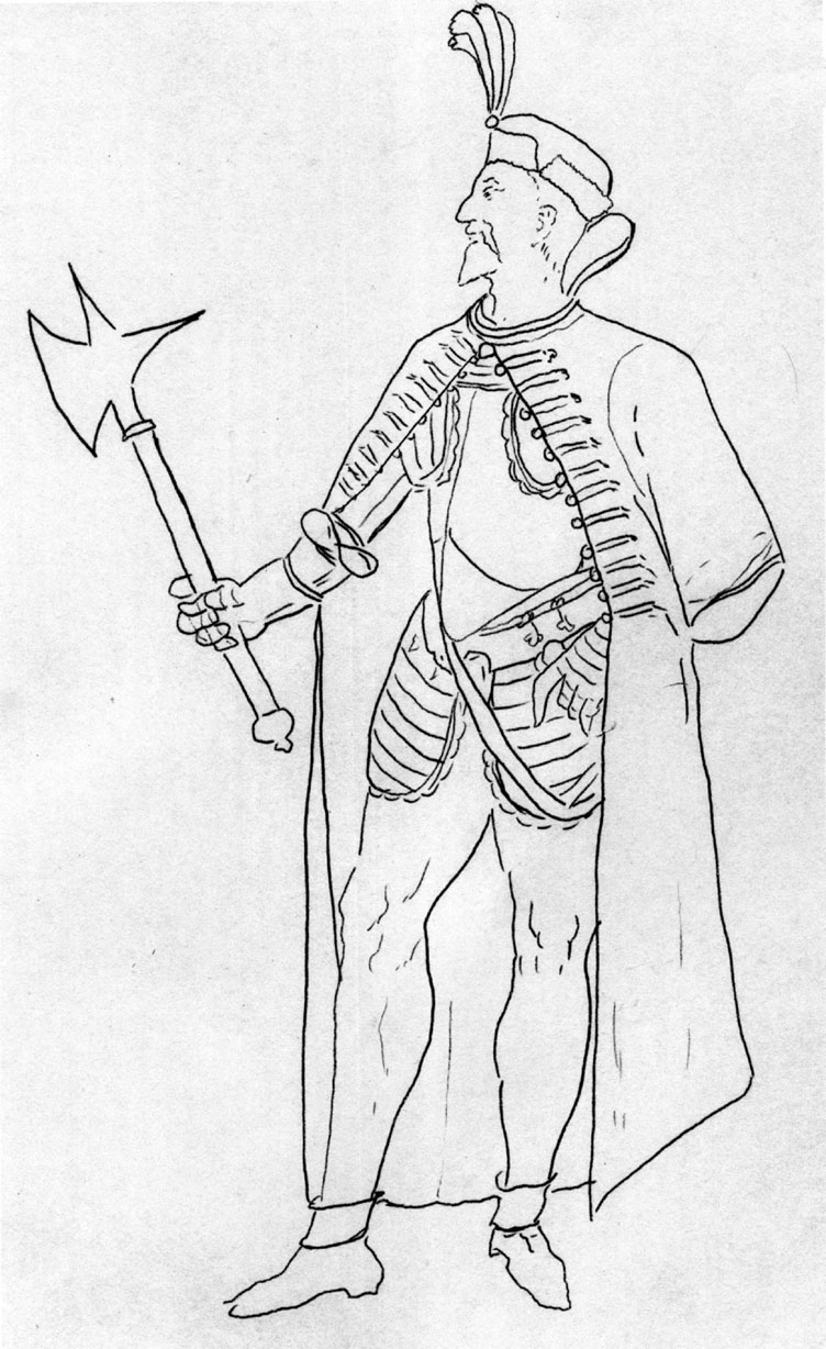 Kolorowe ilustracja. Przedstawia mężczyznę stojącego we wnętrzu, na tle bordowej kotary. Mężczyzna ubrany jest w błękitny żupan, oraz czarny płaszcz z futrzanym kołnierzem. Na głowie ma wysoką czapkę. Przepasany jest pasem kontuszowym. W lewej ręce trzyma szablę. Przed stołem pokrytym zielonym suknem leży zbroja, zaś po lewej stronie pies. W tle czerwona kotara.
