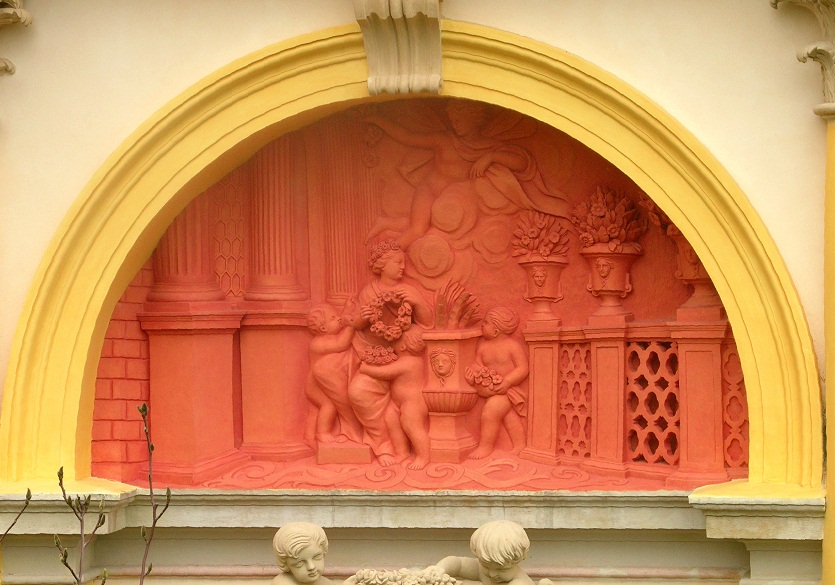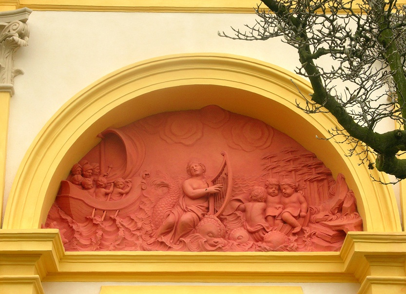 Płaskorzeźba pomalowana na kolor pomarańczowy, umieszczona nad wejściem pałacowym. Przedstawia kobietę grającą na harfie. Po prawej stronie trzy małe dzieci, po lewej stronie płynie łódź z ludźmi.