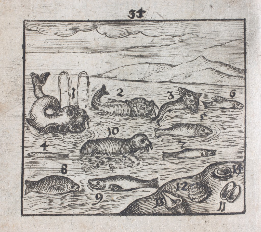 Wśród opisów osobliwych ryb możemy odnaleźć również taki fragment: wielkością do cielęcia, albo psa podobna ryba; skórę ma na sobie twardą, sierścią obrosłą, zęby wielkie na kształt piły żelaznej akomodowane od natury, nóg cztery na kształt gęsich, głowę małą, krótką. Wyrzuca się na brzeg morski i tam twardym snem złożona bywa i chrapie. Jest to opis zwierzęcia, które z pewnością rybą nie jest, chodzi tutaj mianowicie o fokę, u Chmielowskiego nazywaną phoca, bocas czy vitulus marinus.