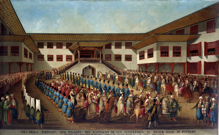 Wspaniałe, z wielkim przepychem organizowane wjazdy polskich poselstw do różnych stolic europejskich miały swoją długą tradycję. Ich celem było wywołanie podziwu i olśnienie cudzoziemców. Służyć miały temu m. in. robiące wrażenie swą oryginalnością polskie stroje. Szczególnie pamiętny był zwłaszcza wjazd Jerzego Ossolińskiego do Rzymu w 1633 r. Do tej tradycji nawiązał również ostatni polski poseł w Stambule, Piotr Potocki (1745-1829), który udał się ze swą misją do Porty Otomańskiej w 1790 r. i chociaż jego legacja nie przyniosła w zasadzie żadnych wymiernych rezultatów, została zorganizowana z wielkim przepychem i nakładem kosztów. Składała się na nią liczna świta janczarów, czohdorów, hajduków, kamerdynerów, dworzan, marszałka dworu poselskiego, tłumaczy, kapelanów, sekretarza i konsyliarza, kawalerów, przyjaciół oraz synów posła. Podczas przejazdu przez miasto i pierwszej audiencji u sułtana wystąpili oni wspaniale odziani w różnorodne stroje polskie, zachodnioeuropejskie i orientalizujące. Ich wygląd oddają dwa obrazy z kolekcji wilanowskiej: Orszak Piotra Potockiego, ostatniego posła Rzeczpospolitej w Stambule w 1790 r. oraz Portret Piotra Potockiego. Oba zostały namalowane najprawdo-podobniej już po odwołaniu Potockiego ze Stambułu ok. 1792 r.