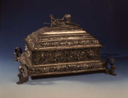 Stara ilustracja. Przedstawia kałamarz srebrny, którego misa jest zdobiona motywami dekoracyjnymi m.in. twarzy. Na szczycie cztery świece i pióro.