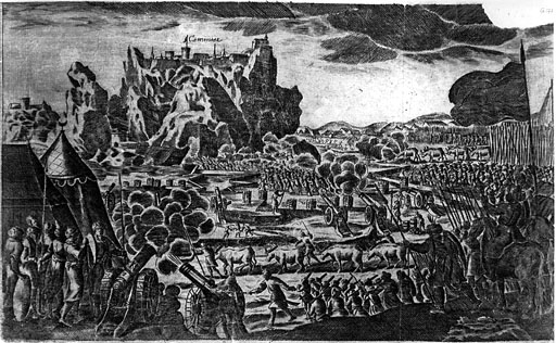 Anonimowy miedzioryt niemiecki (?), powstały zapewne niedługo po sierpniu 1672 r. i pochodzący z bliżej nieokreślonego starego druku, przedstawia rozległy widok oblężenia twierdzy kamienieckiej, usytuowanej w głębi kompozycji na wysokiej, stromej skale.