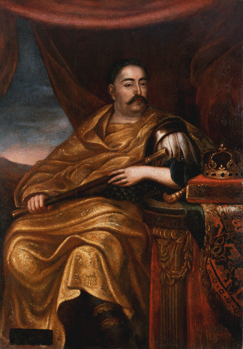 Karta z grafiką. Przedstawia starszego, otyłego mężczyznę, ubranego w strój historyczny. Pod portretem napis: Jakób Sobieski, kasztelan krakowski, ojciec króla.