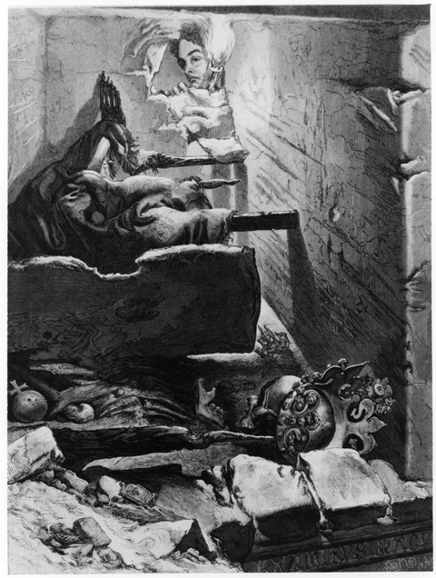 Obecny w komisji Jan Matejko natychmiast sporządził rysunkową dokumentację wnętrza sarkofagu, czaszki królewskiej oraz insygniów i ostróg monarchy. Głęboko poruszony tym wydarzeniem artysta namalował w 1869 r. olejno na tekturze sam moment odkrycia grobowca, a zaglądającemu we wnętrze tumby młodzieńcowi nadał podobno własne rysy. Ciekawa i niespotykana jest koncepcja dzieła. Przedstawia ono wnętrze grobu ujęte od krótszego boku, rozjaśnione przez wybity w nogach otwór w murze i blask pochodni, trzymanej przez zerkającego tam chłopca. Na dnie sarkofagu oraz na jego poprzecznych żelaznych sztabach widać szczątki trumny, szat, kości oraz czaszkę w koronie.