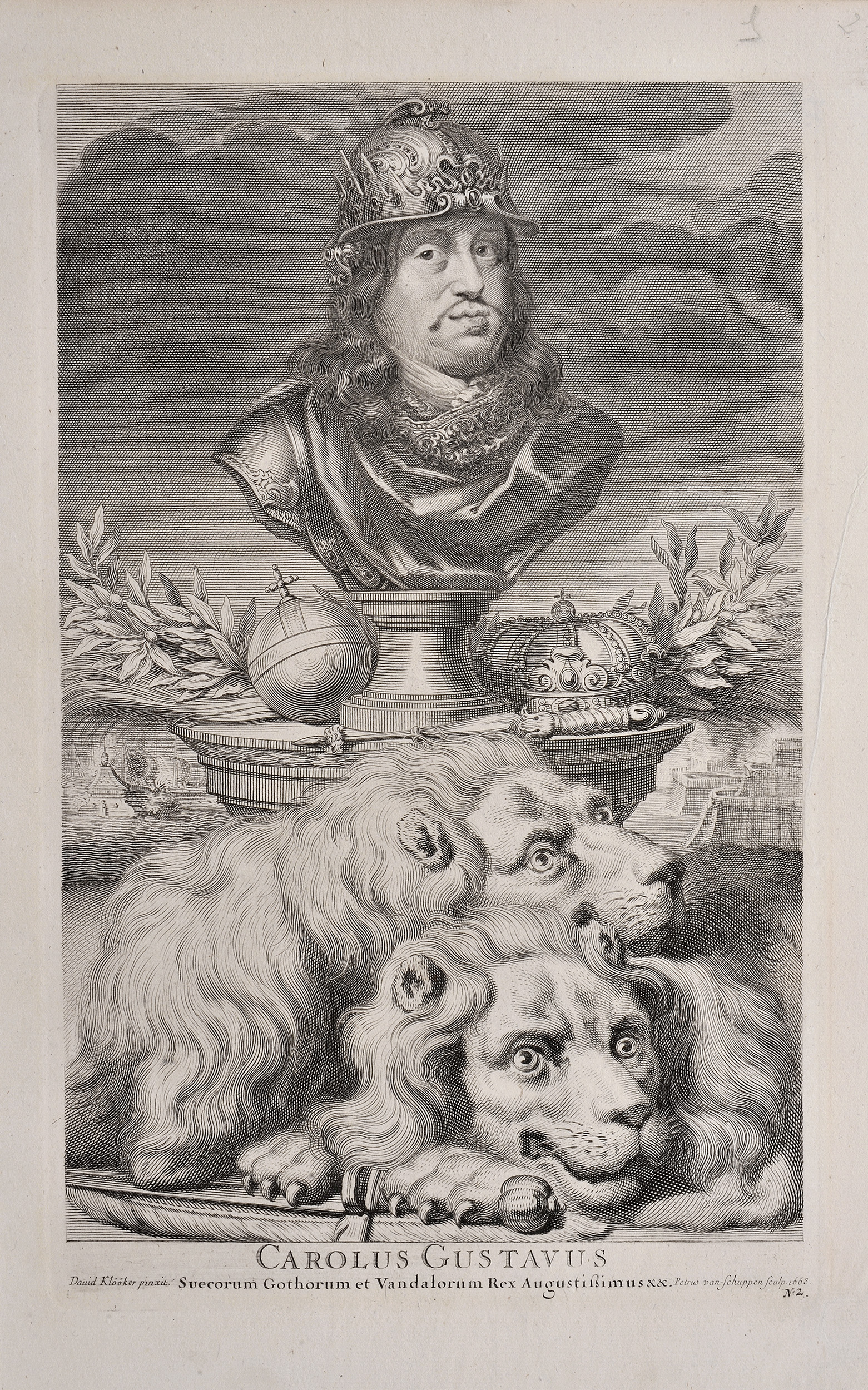 Miedzioryt przedstawia popiersie mężczyzny w hełmie na głowie, ubranego w zbroję i płaszcz. Mężczyzna w średnim wieku, z długimi włosami i cienkim wąsikiem. Poniżej korona i berło. Na pierwszym planie dwa lwy. Jest to Karol X Gustaw wg miedziorytu Piotra van Schuppena.
