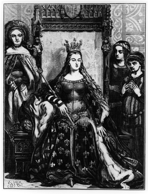 Portret królowej siedzącej na tronie, w otoczeniu dam dworu. Królowa z długimi włosami, w prawej ręce trzyma berło. Ubrana w długą suknię, pas na biodrach i płaszcz podszyty futrem. Po prawej stronie tronu dwie młode dziewczęta, po lewej stronie starsza dama dworu. Jest to Królowa Jadwiga.