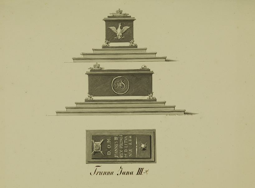 Z tych sieni wszedłem do sali, która jest niemała, cała obita czernym suknem. W tej sali, po lewej stronie, [jest] zrobiony niemały pomost przy ścianie, na trzy stopnie wzwyż, i obity ten pomost cały [jest] aksamitem czerwonym, a na zszyciu [są] koronki złote. Na tym pomoście postawiona trumna, w której leży ciało króla polskiego Jana Sabieskiego. Ta jego trumna [jest] cała obita aksamitem złotym, ze złotymi galonami i frędzlami, i ćwiekami srebrnymi i pozłacanymi. Wokół tej trumny, na stopniach tego wspomnianego pomostu, postawione [jest] trzydzieści świeczników srebrnych, wielkich, w których [są] świece wysokie, woskowe, białe. U nóg ciała królewskiego stoi dwóch wartowników z alebardami. Na górze tej trumny położona [jest] korona złota, w nogach przy trumnie położona poduszka działkowana [tj. fastrygowana] złocona i na niej postawiona szkatuła złota, zrobiona na podobieństwo ludzkiego serca. W tę szkatułę, przy pogrzebaniu królewskiego ciała, wyjąwszy z niego serce, położą i pogrzebią to królewskie serce w [W]arszawie, a ciało królewskie zawiozą z Warszawy do Krakowa i pogrzebią w Krakowie. Kiedy wszedłem w tę wyżej wspomnianą salę, w tym czasie w tej sali celebrowało msze przy trzech stołach ofiarnych tam postawionych trzech księży rzymskich, to jest nabożeństwa za duszę wspomnianego zmarłego króla polskiego; ubiór trzech rzymskich popów [był] czerny. Nad trumną, w której leży ciało królewskie, umieszczona [została] jego postać [wizerunek], namalowana na grubym płótnie, w złoconych rzeźbionych ramach.