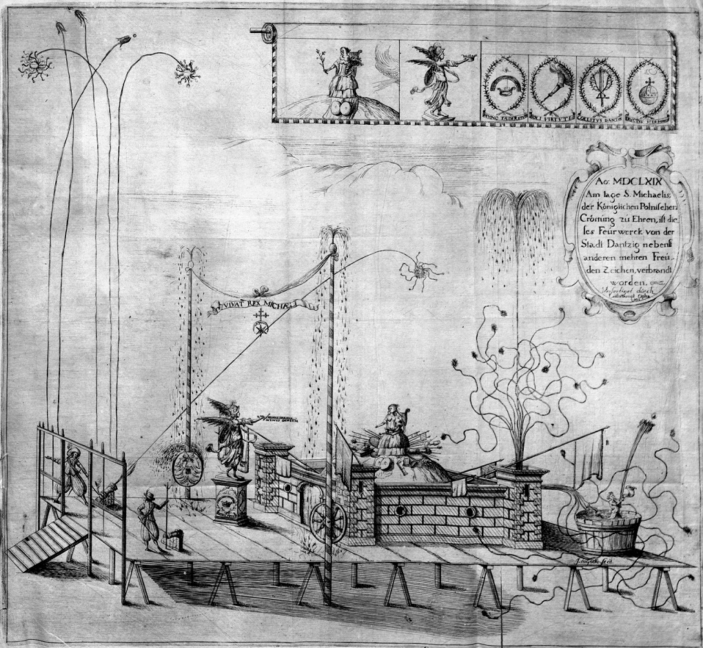 Z okazji koronacji Henryka Walezego (1574) na wzgórzu wawelskim skonstruowano figurę rycerza na koniu (Pogoń) emitującego ogień. Jezuici warszawscy w ramach oprawy zaślubin króla z Cecylią Renatą (1637) „rozmaitemi lampami, ogniami, obrotami słonecznemi, miesięcznemi, wieżę swoją przykryli i otoczyli”, zaś podskarbi koronny ze specjalnie uformowanej wieży „foremne i odważne ognie i race puszczać kazał”. “Ognie artificjalne” wybuchały także na cześć koronowanego 29 września 1669 r. Michała Korybuta Wiśniowieckiego. Niestety, obciążające kasę stołeczną 300 florenami, przygotowane przez panów Rabela i Przybysławszczyka fajerwerki na rynku krakowskim nie wypaliły, a konkretnie „trafunkowym na spod iskry zapadnieniem, w jedno płomienia chaos idąc, spodziewanego nie uczyniły afektu” (J. A. Janicki, Akt koronatiey…Michała, Kraków 1670). Więcej szczęścia lub wiedzy technicznej okazali się mieć puszkarze gdańscy. Zachowana w kilku egzemplarzach rycina Johanna Michaela Gockhellera (odbitka 35 x 32cm, Biblioteka Gdańska PAN, Nl 62 adl. 38 oraz Archiwum Państwowe w Gdańsku 300, R/Ff 51) przedstawia fajerwerki zaprezentowane w grodzie nad Motławą w dniu św. Michała przez porucznika Uphagena. Obok złożonych emblematów, głównym elementem kompozycji była figura tronującej na ufortyfikowanym wzniesieniu Lechii oraz Michała Archanioła –prefiguracja nowego władcy.  Na jego mieczu dostrzegamy napis: MUNUS DEORUM – „dar bogów”.
