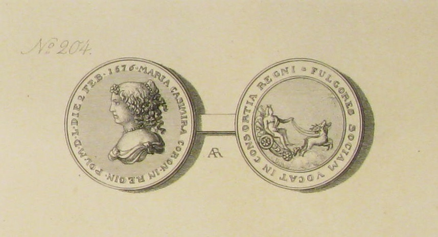 Podsumowując, należy zauważyć, że przyjęty sposób wyróżnienia Marii Kazimiery, nawiązujący bezpośrednio do wzorców rzymskich, polegający na uwiecznieniu postaci podczas jazdy rydwanem w realiach fantastycznych lub historycznych, znalazł kontynuację w programie okolicznościowych grafik i płaskorzeźb wykonywanych zwłaszcza po największym osiągnięciu militarnym króla ‒ zwycięskiej odsieczy wiedeńskiej. Wymienić w tym miejscu można chociażby kompozycję sztukatorską ukazującą triumf polskiego monarchy: uroczysty przejazd Jana III Sobieskiego na rydwanie, wykonaną pomiędzy 1686 a 1694 rokiem, zlokalizowaną zaś na elewacji frontowej skrzydła południowego pałacu wilanowskiego. Opisywany żeton i medal stanowiły więc jedynie element kampanii propagandowej zakrojonej na znacznie większą skalę i realizowanej przez następne lata rządów królewskich, której podstawowym celem stało się upamiętnienie reprezentantów rodu Sobieskich na równi z innym członkami europejskiej elity. Prócz przytoczonych przykładów istnieje szereg grafik i portretów malarskich, a także liczne monety i medale, na których widnieje podobizna Jana III Sobieskiego w kostiumie antycznym: paludamencie, zbroi karacenowej z kwadratowym wycięciem wokół szyi i wieńcem laurowym na głowie. Do podobnych idei zaczerpniętych ze świata antyku nawiązywali także inni władcy, posiadający znacznie szersze prerogatywy polityczne m.in. Leopold I Habsburg.