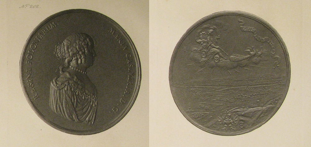 Królowa świadoma roli taktyki propagandowej, zakładającej m.in. konsekwentne powoływanie się na powszechnie akceptowalne wartości za pomocą różnego rodzaju środków, przez następne lata rządów korzystała z okolicznościowych medali, żeby kontynuować i twórczo rozwijać dotychczasowy przekaz. Nic dziwnego więc, że kolejny numizmat ̶ medal z 1677 roku autorstwa Jana Höhna (Hoehna) młodszego ̶ mimo iż różni się od poprzedniego dzieła sztuki, również inspirowany był tematyką mitologiczną. Na jego awersie przedstawiono wizerunek Marii Kazimiery, ujętej w półpostaci, w sukni z dekoltem wykończonym koronką i otoczonym sznurem pereł, w narzuconym udrapowanym płaszczu gronostajowym z kwadratową broszą na ramieniu, naszyjniku perłowym oraz niewielką koroną na czubku głowy. Całość otacza napis o następującej treści: MARIA CASIMIRA D[ei] G[ratia] REGINA POLONIARUM (Maria Kazimiera z Bożej łaski Królowa Polaków).