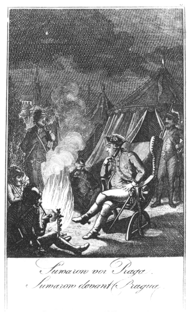 W serii ośmiu miniaturowych akwafort Daniela Mikołaja Chodowieckiego (1726-1801), ilustrujących historię carycy Katarzyny II, nie mogło zabraknąć sceny Suworow pod Pragą. Cykl ten znalazł się w berlińskim „Historisch – Genealogischer Kalender auf das Gemein – Jahr 1798”. Niesygnowana rycinka przedstawia wodza siedzącego na wyściełanym fotelu, przy ognisku, nocą (być może poprzedzającą szturm), w otoczeniu żołnierzy kurzących fajki. W tle widać rozbite namioty oraz ledwo zauważalne w mroku zabudowania Pragi.