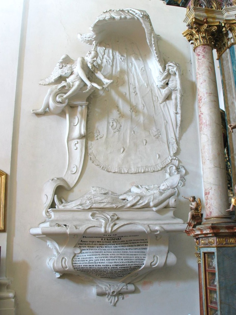 Opat Łukomski zmarł w 1750 roku, a nagrobek wystawiono po jego śmierci z inicjatywy jego następcy, Konstantego Iłowieckiego. Jaki rzeźbiarz tego dokonał – na razie pozostaje tajemnicą. Historyk sztuki mógłby powiedzieć, że samo przedstawienie opata jest osobliwe, wręcz archaiczne. Nagrobki z postaciami pogrążonymi we śnie powstawały w czasach renesansu, czyli – na terenie Rzeczypospolitej – głównie w XVI wieku. Bardziej żarliwa i ostentacyjna religijność ludzi baroku spowodowała, że zmarły w czasach późniejszych przedstawiany był jako osoba żyjąca, pogrążona w modlitwie. Niekiedy spoglądał na wiernych z rzeźbionego czy malowanego portretu.