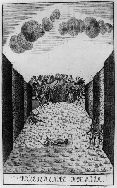 Intensywna działalność literacka księżnej Franciszki Urszuli z Wiśniowieckich Radziwiłłowej (1705 – 1753), pierwszej żony Michała Kazimierza „Rybeńki”, wiązała się z powstaniem teatru na zamku w Nieświeżu. Młoda księżna zainteresowanie teatrem wyniosła z domu rodzinnego, zapewne pod wpływem stryja Michała, który w Wiśniczu utrzymywał własną prywatną scenę; sam „Rybeńko” także lubił podobne spektakle. Były one wystawiane w Nieświeżu, mniej więcej dziesięć razy do roku, w przystosowanych do tego budynkach (w Akademii Wojskowej w latach 1747 – 1757, w zamku na scenie zw. Komedyhauzem od 1748 r., wreszcie w mieście, w podobnym Komedyhauzie, od 1758 r.) oraz na wolnym powietrzu. Te ostatnie w osiemnastowiecznej Polsce dzieliły się na prowizoryczne (sceny i widownia wznoszono w ogrodach, parkach i placach, a po spektaklu rozbierano je), stałe (budowane z trwałego materiału w parkach, zwykle na wzór teatrów antycznych), na ostatek „zielone” (wykonane z odpowiednio strzyżonych roślin). Teatr „zielony” – ze sceną z kulisami wkomponowanymi w zieleń i z widownią w formie równi pochyłej, usypanej z ziemi – znajdował się w pałacyku Konsolacja koło Nieświeża i czynny był w latach 1745 – 1756. Księżna Radziwiłłowa zadebiutowała jako dramatopisarka 13 czerwca 1746 r., wystawiając – napisaną z okazji kolejnych imienin i urodzin małżonka – pierwszą komedię Miłość dowcipna. Odtąd stale zasilała scenę nieświeską swoimi nowymi utworami, do których tematy czerpała z sielanek pasterskich i alegorycznych, dramatów szkolnych, komedii dell’ arte, z obcych i rodzimych baśni oraz powieści, nawet z dzieł hagiograficznych i średniowiecznych misteriów. O edycji zbiorowej sztuk Franciszki Urszuli myślano jeszcze z życia autorki. W 1751 r. ukazało się w Nieświeżu pierwsze, niepełne jeszcze wydanie jej dramatów, ale w formie ostatecznej nastąpiło ono najprawdopodobniej we Lwowie w 1754 r., pt. Komedye y Tragedye. Druk, zawierający ogółem 14 sztuk (m. in. Opatrzności Boskiey dzieło, Przeyrzane nie mija, Niecnota w sidłach, Z oczu się miłość rodzi), został zilustrowany tylomaż miedziorytami autorstwa Michała Żukowskiego, dość miernego grafika zatrudnionego w latach 1756 – 1760 we Lwowie, Krakowie i Lublinie. Ryciny te, zamieszczone jako tablice między stronami i wykonane według własnoręcznych rysunków Radziwiłłowej, dzielą się na dwie grupy: sensu stricto ilustracja utworu scenicznego oraz przedstawienie faktycznego spektaklu na dworze radziwiłłowskim. Bez względu na mierny poziom artystyczny tak pierwowzorów jak i miedziorytów, wymieniona grafika jest interesującym materiałem ikonograficznym do dziejów teatru w XVIII- wiecznej Polsce. I tak np. w sztychu Przeyrzane nie mija widzimy strzyżone żywopłoty, stanowiące kulisy ogrodowego, „zielonego” teatru, w którym właściwy spektakl ukazany został na pierwszoplanowej murawie. Zamykającą odległy plan widownię usytuowano w głębi, lecz niezgodnie z zasadami perspektywy ( w stosunku do szpalerów i pierwszoplanowych aktorów powinna być ona przedstawiona w skali znacznie mniejszej). Na rokokowej kanapce zasiadła sama autorka sztuki w towarzystwie młodej damy i trzech kawalerów w mundurach. Za nimi cisną się panowie kontuszowi i matrony. Wysoko nad głowami widzów unoszą się obłoki, przypominające bardziej jakieś wielkie skamieliny.