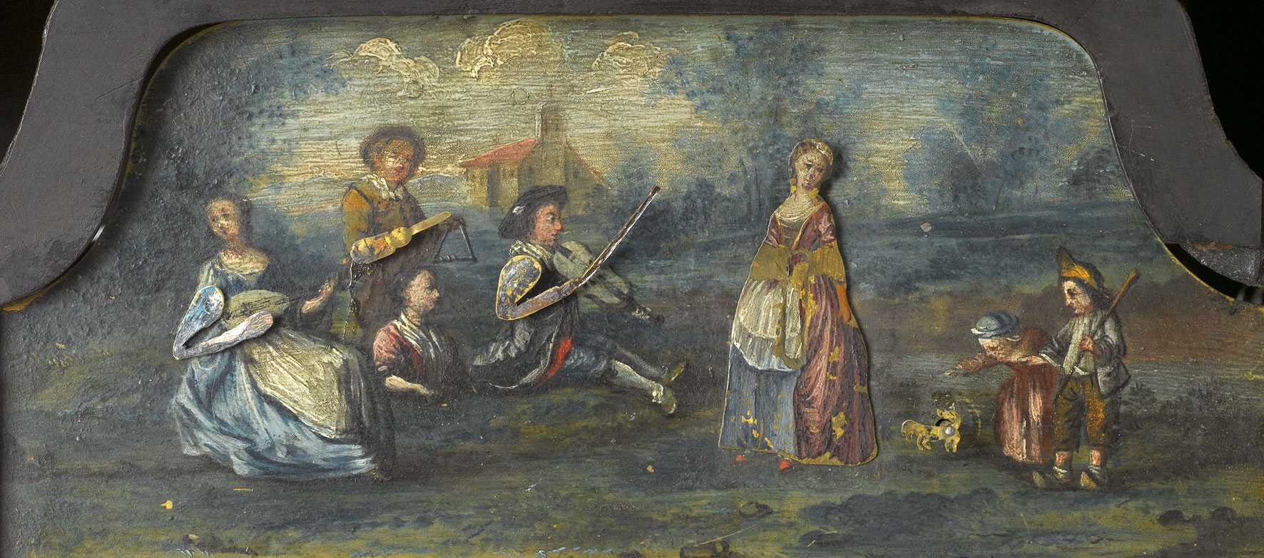 Zdjęcie ukazuje fragment malowidła. Jest to scena sielska rozgrywająca się w pejzażu. Przedstawia dziewczęta i chłopców grających na instrumentach muzycznych. W tle kościół. Jest to fragment dekoracji zegara z Sypialni Królewskiej (scena tańca), z kolekcji Muzeum Pałacu Króla Jana III w Wilanowie.
