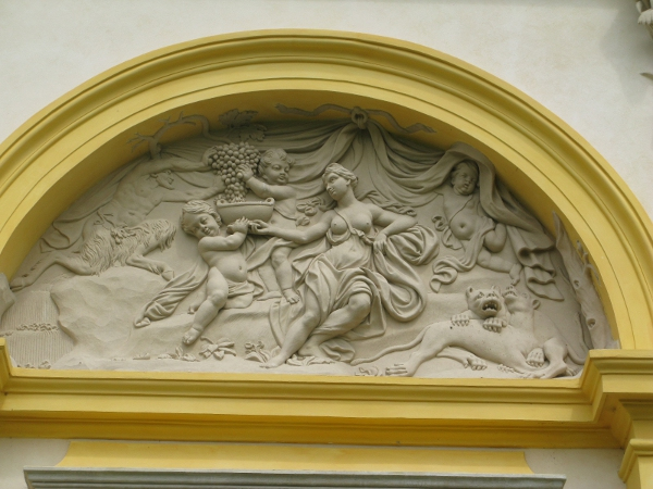 O symbolice winorośli można pisać bez końca. Ze względu na rodzaj scen przedstawionych na wilanowskim pałacu zajmijmy się bliżej symboliką winorośli w starożytnej Grecji. Roślina ta jest przedstawiana jako atrybut Dionizosa (czyli Bakchosa, rzymskiego Bachusa). Ów bóg płodności nosił na głowie wieniec z liści winorośli, a w dłoni dzierżył tyrs – laskę oplecioną pędami winnej latorośli i zwieńczoną szyszką piniową (sosna pinia to piękne drzewo rodzące wielkie szyszki z pożywnymi nasionami uznawanymi za afrodyzjak). Powszechnie znane są także wybryki Dionizosa, których dopuszczał się pod wpływem upojenia winem... W szalonych eskapadach towarzyszyli mu satyrowie – pół ludzie, pół kozły z kopytami i ogonem, natarczywie narzucający się nimfom. Dwu takich rozbrykanych zawadiaków możemy zobaczyć także w Wilanowie.