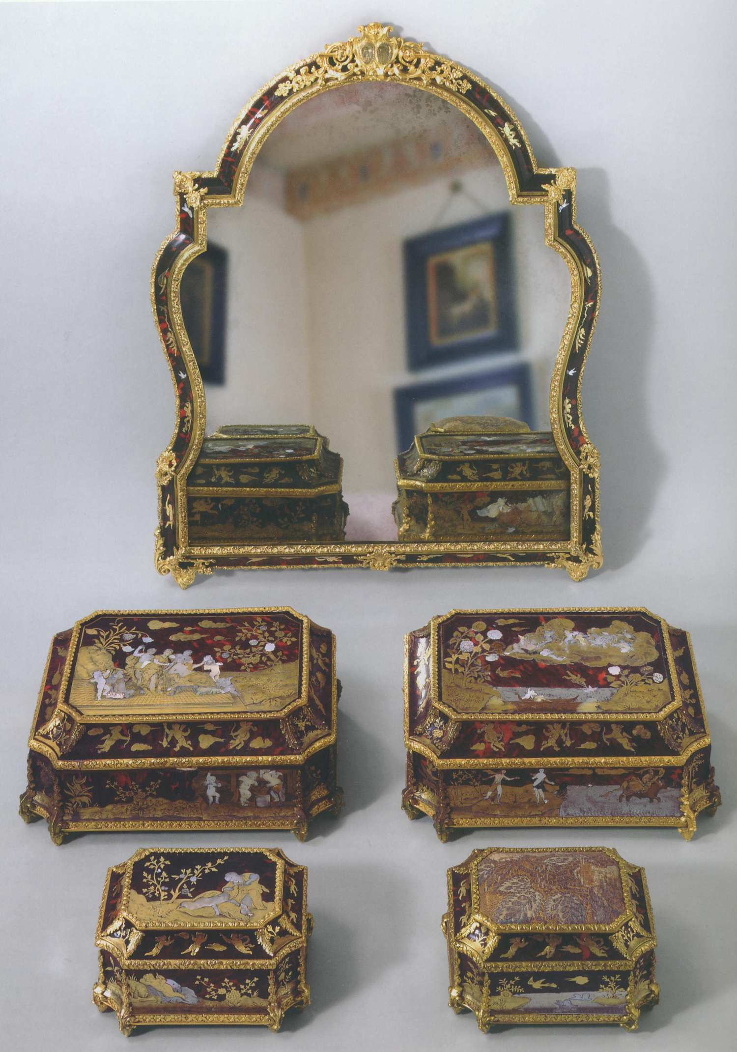 Dwie szklane flaszki ze srebrną nakrętką. Dekorowane na płaskim brzuścu. Jest to umieszczony pod koroną królewską herb Janina otoczony łańcuchem Orderu Świętego Ducha - wskazują na ich właściciela, najmłodszego syna władcy, Konstantego Sobieskiego. Jednolite stylistycznie wysokiej klasy rytowanie.
