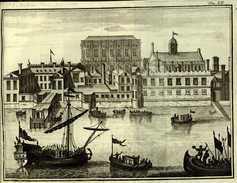 Grafika przedstawia widok na zabudowania miejskiej nad rzeką. Na pierwszym planie szeroka rzeka, statek i małe kutry rybackie. Jest to widok na Pałac Whitehall i widok Tamizy w Londynie.