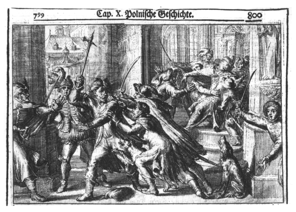 Grafika ze sceną walki, która rozgrywa się we wnętrzu. Ukazuje krzyczących mężczyzn walczących ze sobą. Po prawej stronie, na podwyższeniu mężczyzna w długich szatach (król?) którego ludzie szarpią. Jest to zamach na króla Zygmunta III, rycina z dzieła Hioba Ludolfa.