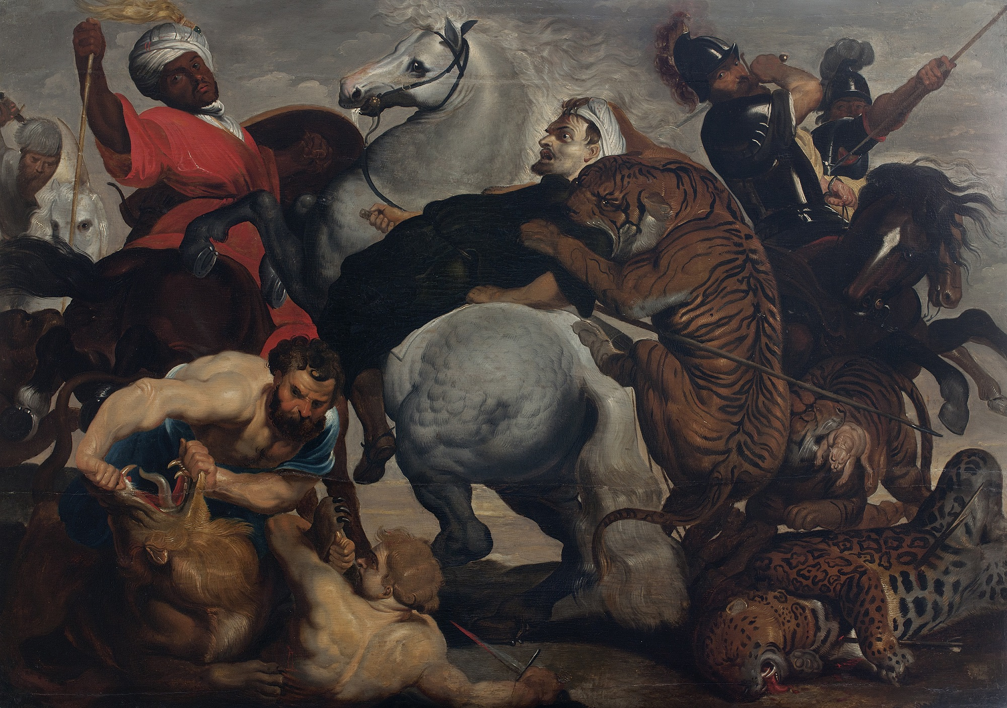 Maksymilian I, późniejszy Elektor Bawarii, zamówił u Rubensa serię czterech obrazów przedstawiających sceny z polowań do dekoracji starego pałacu Schleissheim. Zostały one skonfiskowane w czasie wojen napoleońskich i dziś nie są eksponowane symultanicznie. Najbardziej nas interesujące Polowanie na tygrysa, lamparta i lwa namalowane w 1617 r. aktualnie znajduje się w Musée des Beaux-Arts w Rennes; Polowanie na dzika – w marsylskim Musée des Beaux-Arts, a Polowanie na hipopotamy i krokodyla, które jako jedyne powróciło do Monachium, w Bayerische Staatsgemäldesammlungen. Z kolei kulminacja artystyczna całego cyklu, Polowanie na lwa, spłonęło 7 XII 1870 w muzeum w Bordeaux.