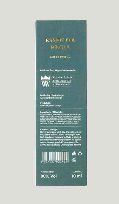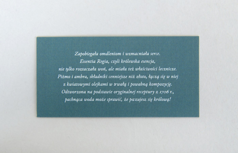 Zapobiegała omdleniom i wzmacniała serce – Essentia Regia, czyli królewska esencja, nie tylko roztaczała woń, ale miała też właściwości lecznicze. Piżmo i ambra, składniki cenniejsze niż złoto, łączyły się w niej z kwiatowymi olejkami w trwałą i powabną kompozycję. Zapach został odtworzony na podstawie oryginalnej receptury z 1706 r. Ta kunsztownie pachnąca woda może sprawić, że poczujesz się królową!