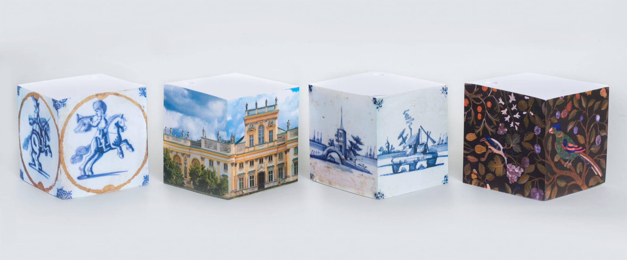 Notes w kształcie kostki z nadrukiem bocznym przedstawiającym fasadę pałacu wilanowskiego.