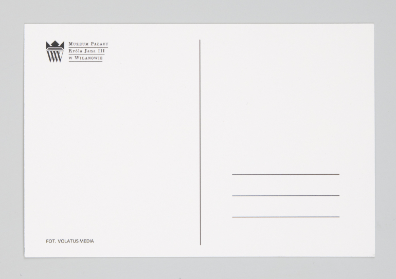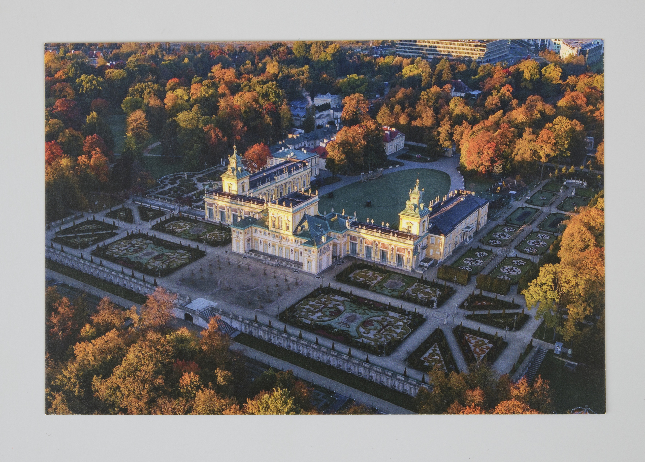 Pocztówka z widokiem rezydencji królewskiej z lotu ptaka.