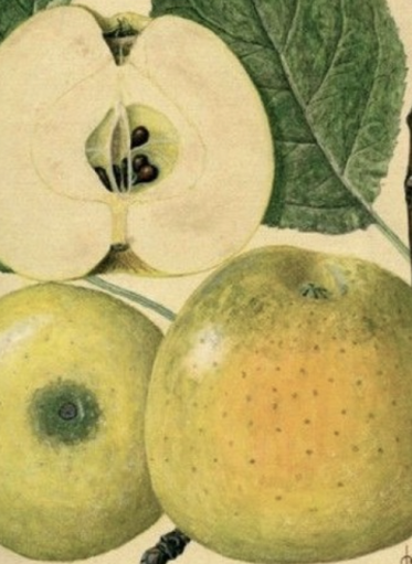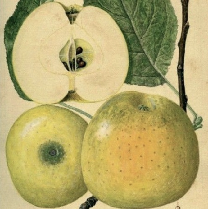 Jabłka tej odmiany to średniej wielkości, kuliste owoce z lejkowatym zagłębieniem na wierzchołku, z którego wystaje w górę ogonek. Mniejsze zagłębienie u dołu jest wylotem gniazda nasiennego. Skórka koszteli ma jasnozieloną lub żółtozieloną barwę i ściśle przylega do miąższu. Jabłka, które zwrócone są w stronę słońca, najczęściej dodatkowo okraszone są niewielkim, okrągławym rumieńcem, wpadającym lekko w pomarańcz. Cała powierzchnia skórki jest mniej lub bardziej nakrapiana drobnymi, ciemniejszymi cętkami. Wnętrze owocu skrywa soczysty, słodki, dosyć zbity, twardy miąższ o jasnokremowej barwie. Centralnie wewnątrz owocu znajduje się okrągławe gniazdo nasienne, mieszczące najczęściej kilka niewielkich brązowych nasion o spłaszczonym łezkowatym kształcie.