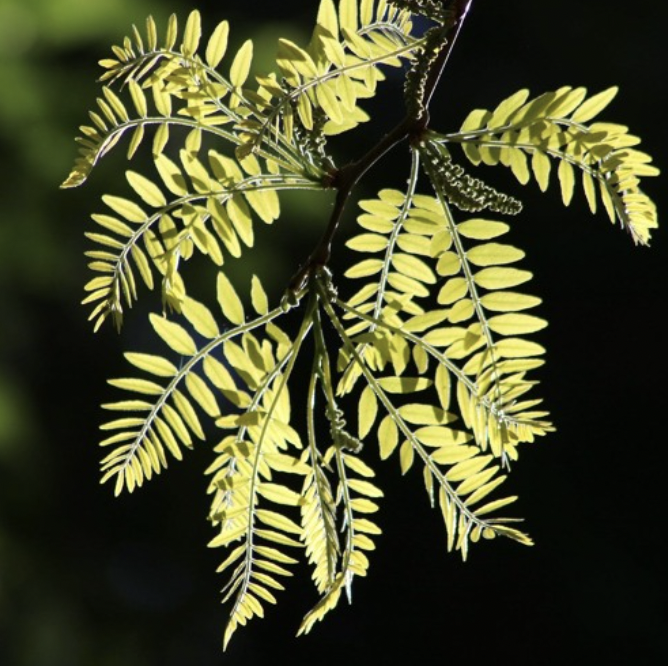 Prócz cierni z pędów wyrastają okazałe, dochodzące do 20 centymetrów długości liście. Liście mogą być parzystopierzastozłożone z 20–30 wąskojajowatymi listkami. Jeden liść składa się wtedy z centralnego, długiego ogonka liściowego. Wzdłuż całego ogonka z obydwu jego stron, lekko w górę na skos wyrastają pojedyncze, jajowate listki z karbowanopiłkowanym brzegiem blaszki liściowej. Najwyżej ulokowana para listków tworzy na szczycie literę V. Oprócz parzystopierzastozłożonych mogą występować również podwójnieparzystopierzastozłożone. Te „podwójne” mają jeden, jeszcze dłuższy osiowy ogonek, ale tym razem odchodzą od niego na boki całe wcześniej opisane parzystopierzastozłożone liście, a nie pojedyncze, małe, jajowate listki.
