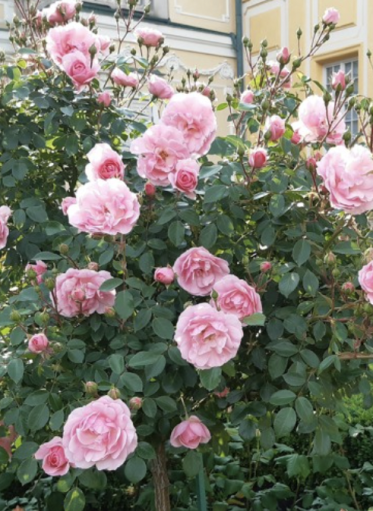 Prostokątne kwatery wypełniają wysokie krzewy o dużych, pełnych, kremowo-różowych kwiatach. Wewnętrzne okrągłe kwatery porastają krzewy o ciemnoróżowych, intensywnie, słodko pachnących kwiatach.