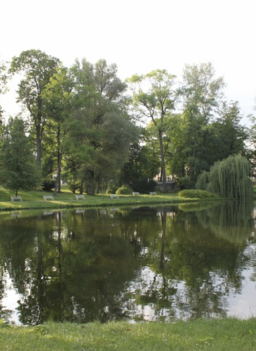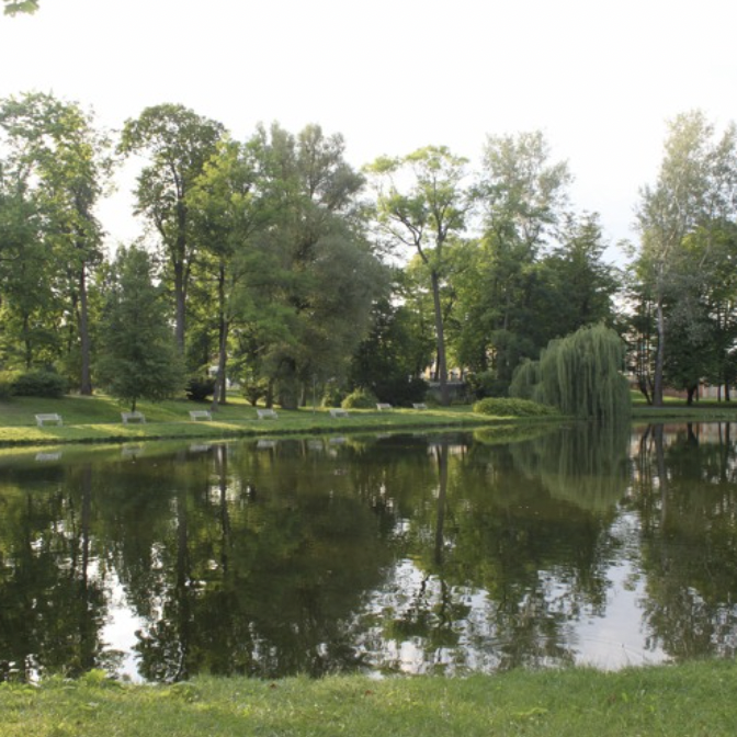 W północno-zachodniej części stara wierzba płacząca opuszcza swe długie, wiotkie gałązki w dół, sięgając powierzchni wody. Od południa z wierzbą sąsiaduje duża, silnie rozrośnięta, gęsta kępa paproci ciągnąca się od alejki nad stawem, aż do jego wód.