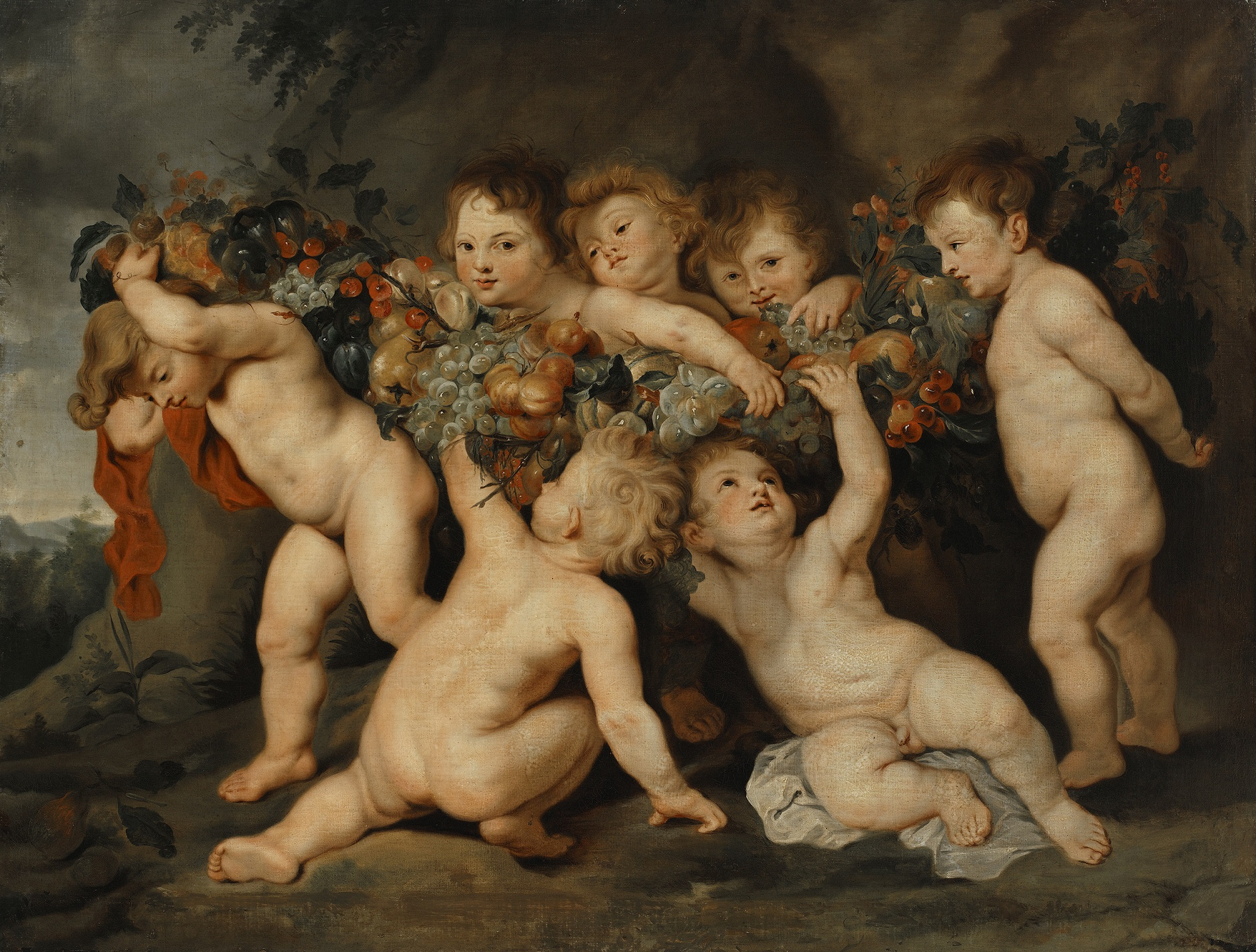 Jest to powtórzenie znanego dzieła Rubensa, znajdującego się w Bayerische Staatsgemäldesammlungen w Monachium, dużych rozmiarów (120 × 203 cm). Obraz chwalono za przemyślaną formę kompozycji, odznaczającą się naturalnością, podziwiano bogactwo i siłę kolorów oraz rozczulano się nad urodą siedmiorga rozbawionych małych dzieci, niosących dużą, uwitą z owoców, girlandę, którą z trudem dźwigają. Motyw girlandy i fryzu pulchnych ciałek dzieci sięga swymi korzeniami do płaskorzeźb z antycznych sarkofagów. Przedstawione z nieco niższej perspektywy sugerowałoby, że obraz przeznaczony był do zawieszenia powyżej linii wzroku, być może w funkcji supraporty. Dzieło jest owocem dobrze rozumianej i powszechnej w pracowni Rubensa pracy zespołowej, w której swe twórcze wysiłki zjednoczyli trzej wybitni i wysoce wyspecjalizowani malarze; Rubens wykonał postacie, Jan Wildens dodał pejzaż, a Frans Snyders wkomponował weń bogatą girlandę owoców. Na koniec Rubens mistrzowskim dotknięciem wykonał jeszcze kilka poprawek do figurek.