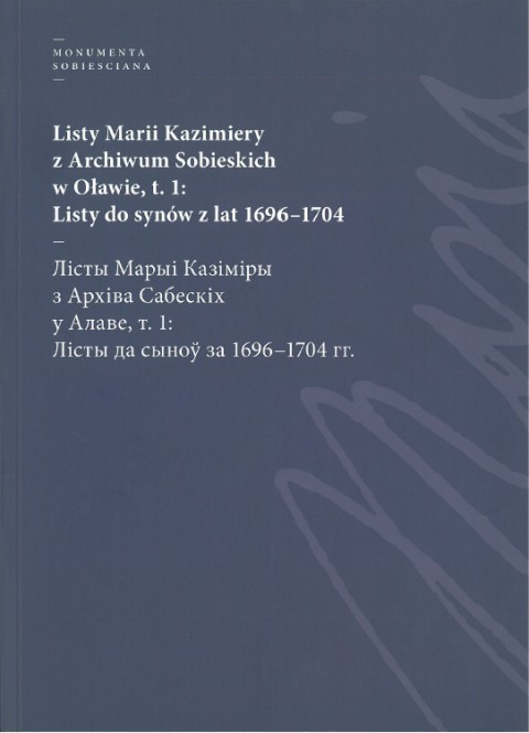 Zasoby Archiwum Sobieskich w Oławie (obecnie w Narodowym Historycznym Archiwum Białorusi w Mińsku) mają fundamentalne znaczenie dla badań dziejów rodu Sobieskich oraz samej Marii Kazimiery. Spośród obszernego materiału źródłowego zachowanego w mińskim archiwum w pierwszej kolejności została opracowana korespondencja królowej skierowana do synów (listy z jednostek nr 256, 257, 258, 259, 260), z okresu po śmierci Jana III, gdy Marię Kazimierę pochłaniały zabiegi o zabezpieczenie i podział majątku rodowego, starania o tron Rzeczypospolitej dla Jakuba Ludwika oraz prób ułożenia relacji z nowym władcą Augustem II. Gdy próby te nie powiodły się, Maria Kazimiera zdecydowała się na opuszczenie Rzeczypospolitej i wyjazd do Rzymu, dzięki czemu uniknęła zepchnięcia do roli „zwykłej” magnatki. Listy pozwalają prześledzić proces dojrzewania do tej decyzji oraz determinację w dążeniu do utrzymania królewskiego statusu rodziny, podtrzymywania pamięci o czynach męża i gloryfikacji osoby Jana III (…).