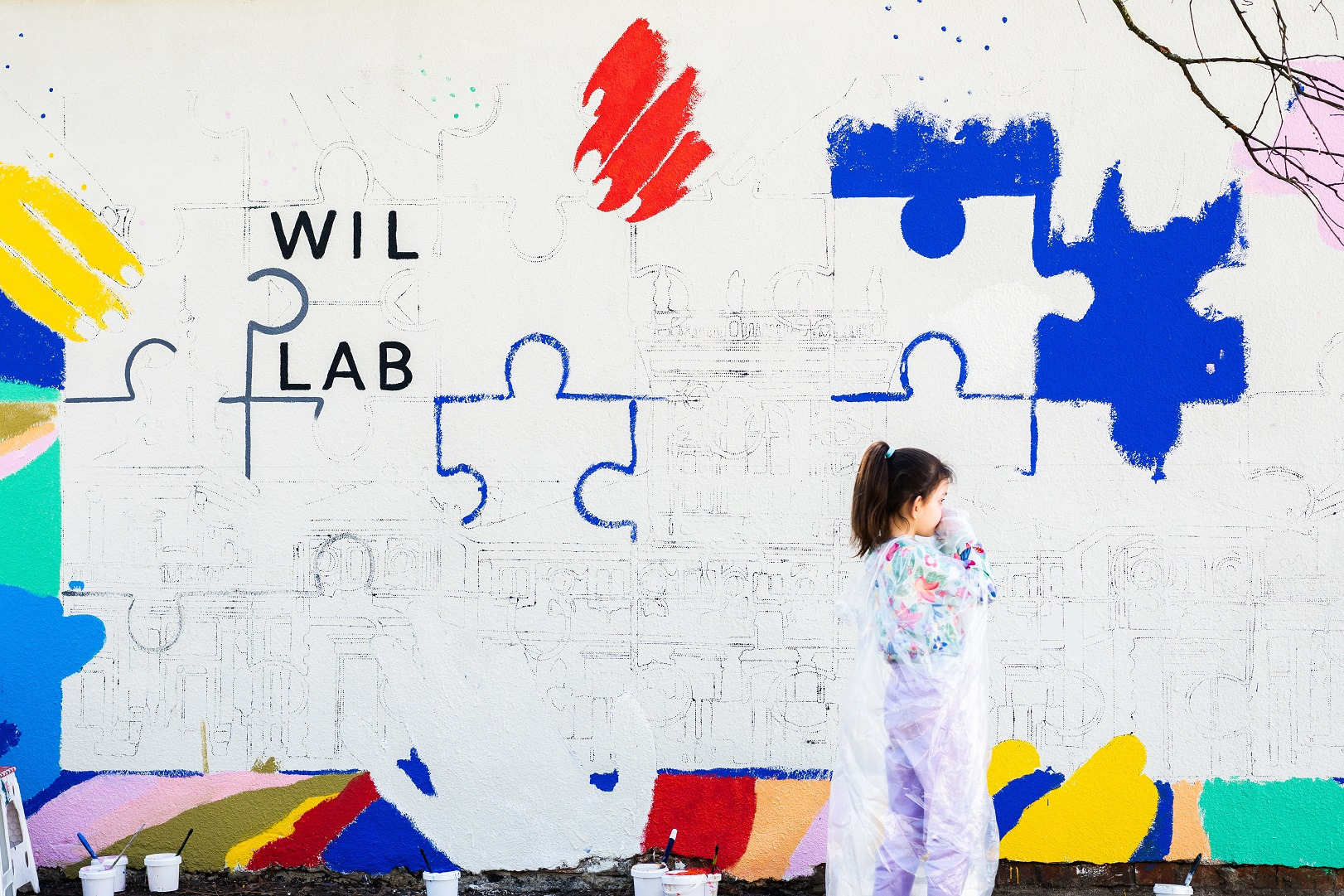 Kolorowe zdjęcie przedstawia małą dziewczynkę, która stoi na tle ściany wymalowanej częściowo w barwne puzle.