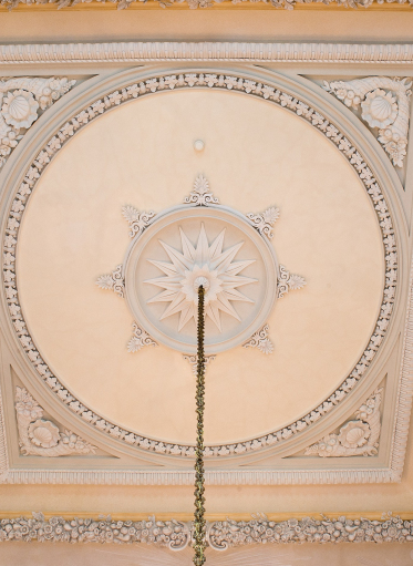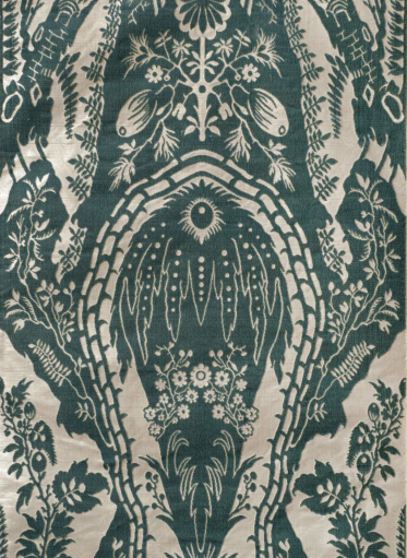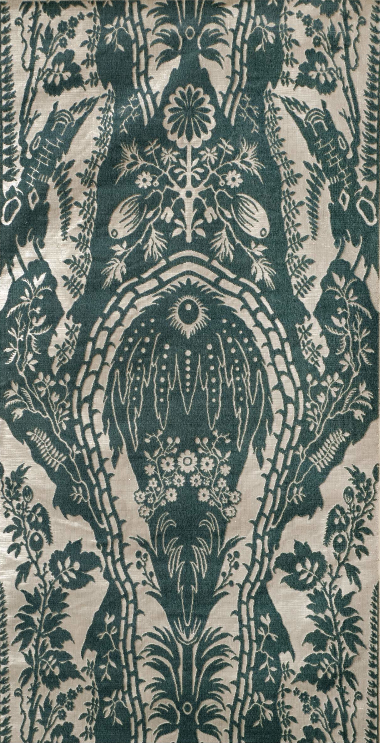 Tę właśnie barwę wykorzystano w rekonstrukcji tkanin, którą wykonano we Włoszech i Francji na XVIII- i XIX-wiecznych krosnach. Odtworzono oryginalny wzór: tworzy go powtarzający się rytmicznie gruszkowaty kształt w otoczeniu ornamentów roślinnych. Uzyskano też kolor odnaleziony na skrawkach tapicerki taboretu. Obecnie tkanina odzyskała dwubarwność: tło jest białawe, a wypukły tkany wzór – błękitnomleczny.