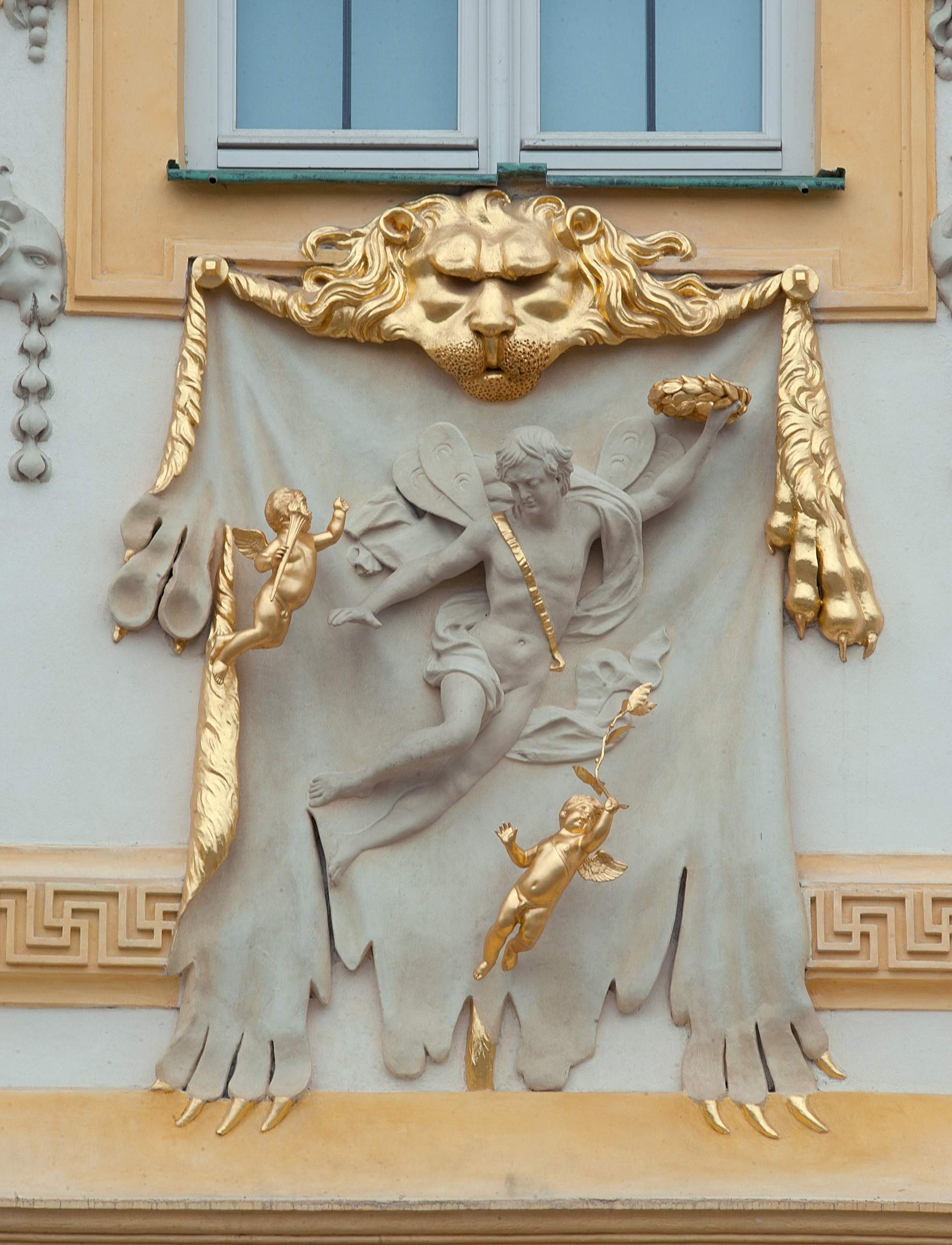 Na koniec Alegoria Chwały została poddana pracom pozłotniczym. Wykonano nowe złocenia na zewnętrznej stronie skóry, wieńcu i wstędze, uzyskując wyrazisty kontrast z elementami białymi. Dzięki temu rzeźba wpisała się w układ ikonograficzno-kolorystyczny dekoracji fasad pałacu.