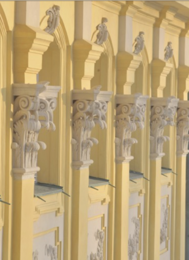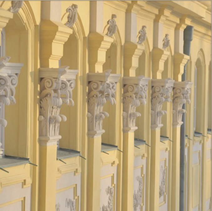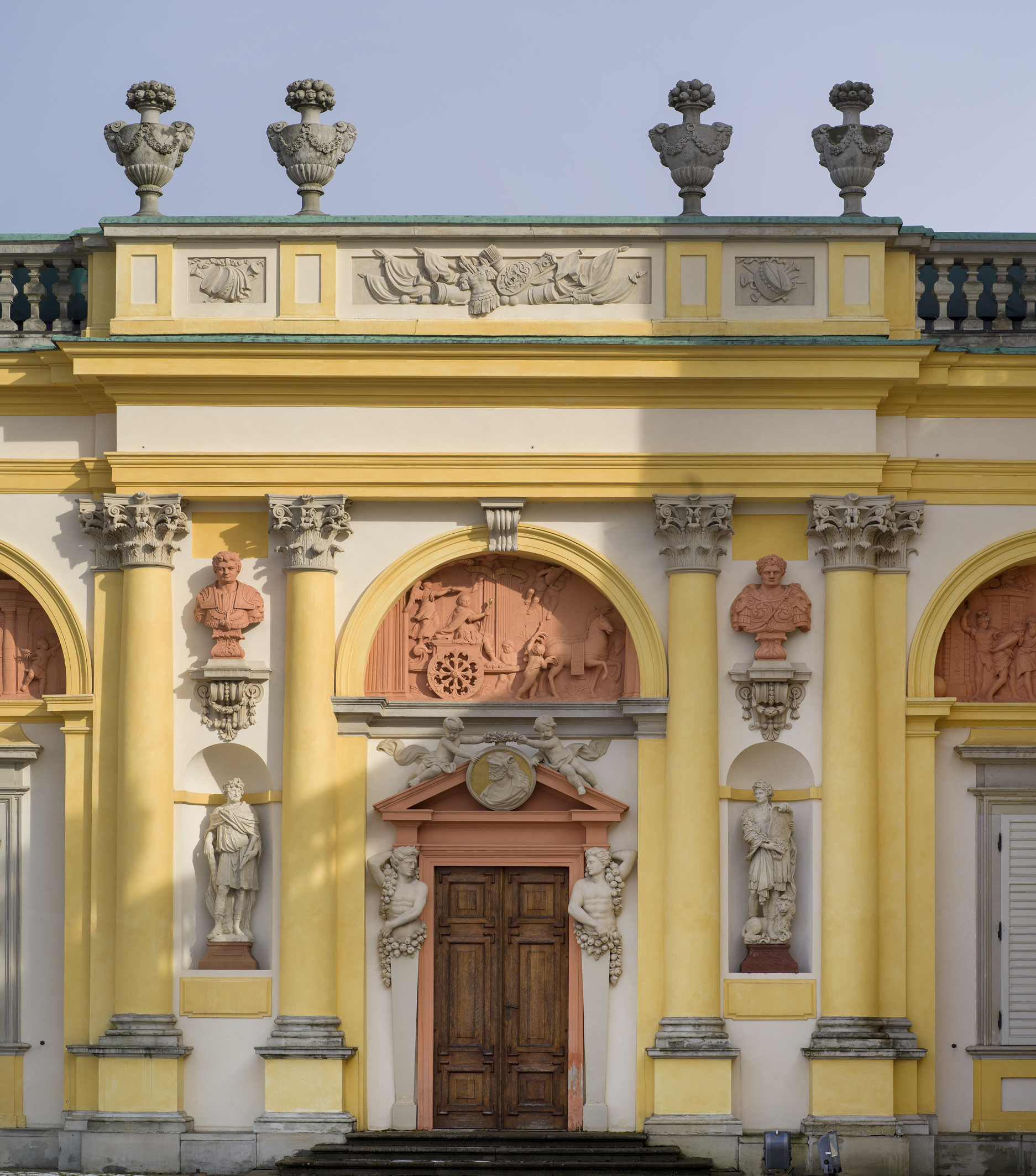 Długa na blisko 70 metrów frontowa elewacja podzielona jest rytmicznie i harmonijnie pionowymi i poziomymi liniami. Półkolumny i pilastry, czyli płaskie filary, ciągną się przez parter i półpiętro. Na nich kładą się kilkustopniowe gzymsy, a między pilastrami i półkolumnami wkomponowane są drzwi, okna i łuki. Pilastry i półkolumny wystające z kremowobiałej ściany są żółte i to za ich sprawą powstaje wrażenie, że całość ma taką samą, intensywną barwę. Kolorystykę uzupełniają charakterystyczne, powtarzające się kolory: pistacjowo-turkusowa zieleń dachów, czyli grynszpan, i ceglasty róż płaskorzeźb, czyli porfir.