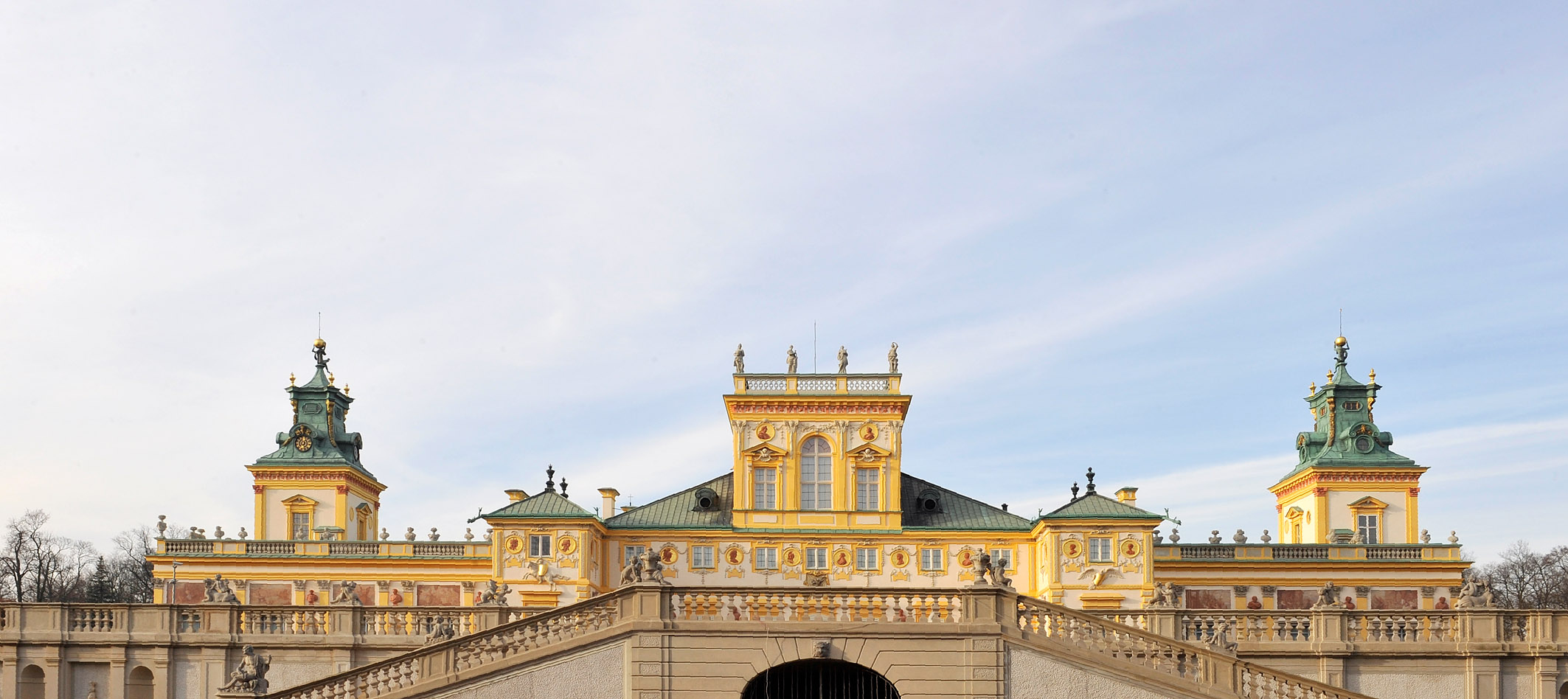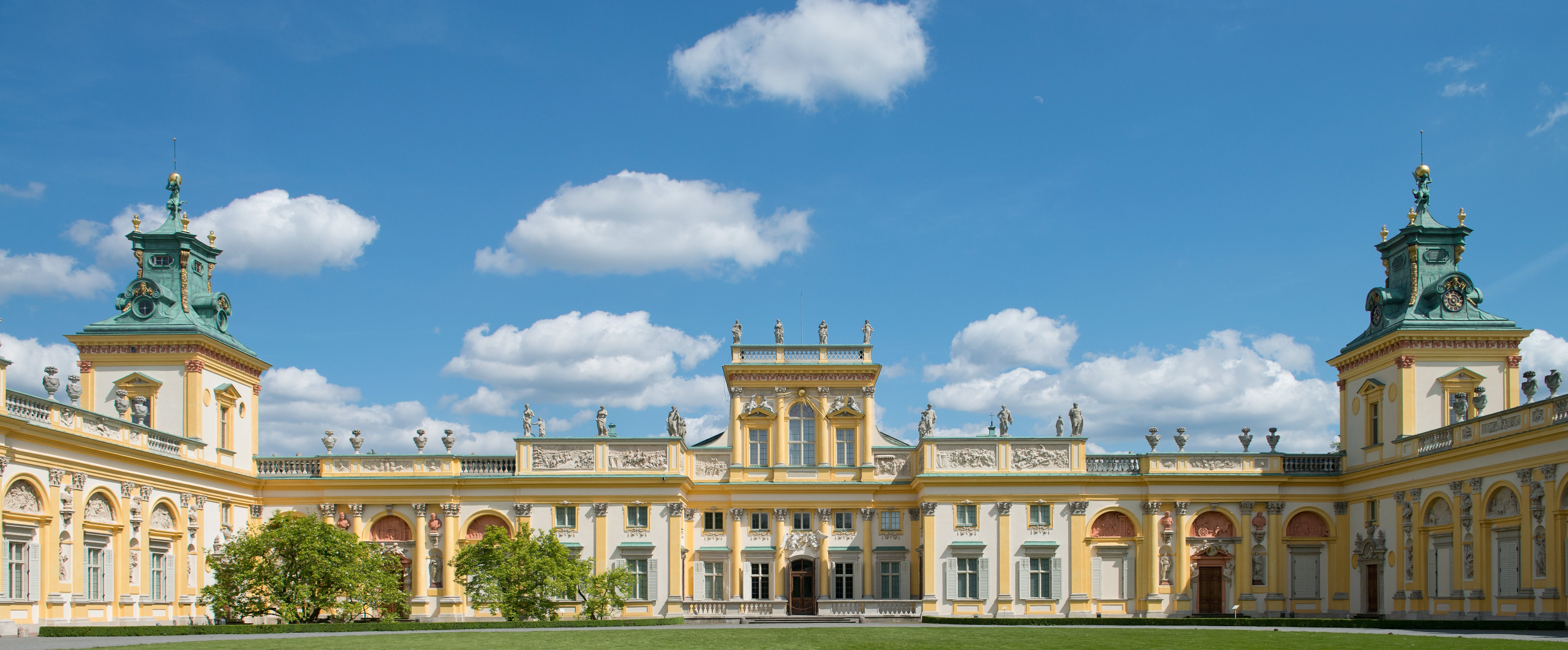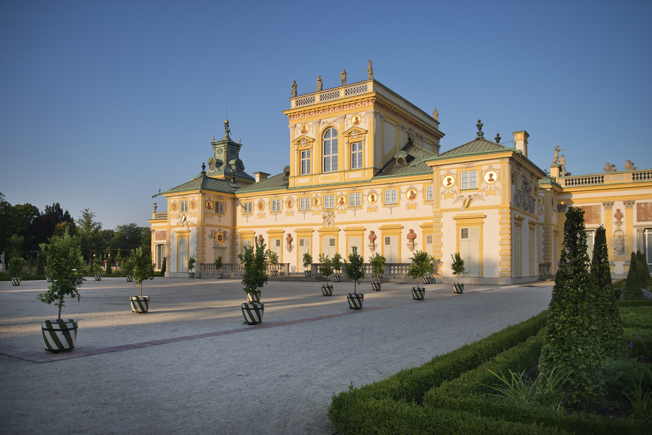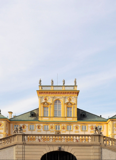 Podkowa słonecznożółtej fasady budynku zamyka dziedziniec pałacowy od wschodu. Skrzy się i mieni w słońcu, niemal błyszczy w pochmurne dni. Zjawiskowo kontrastuje z każdym odcieniem nieba.