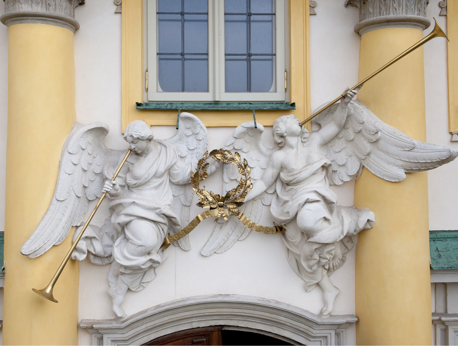 Nad drzwiami umieszczono rzeźbę fam dmących w trąby i trzymających złoty wieniec laurowy. Famy mają głosić chwałę czynów wojennych Jana Sobieskiego i podkreślać, że pokój panujący w ojczyźnie jest wynikiem dokonań króla podczas wojen.