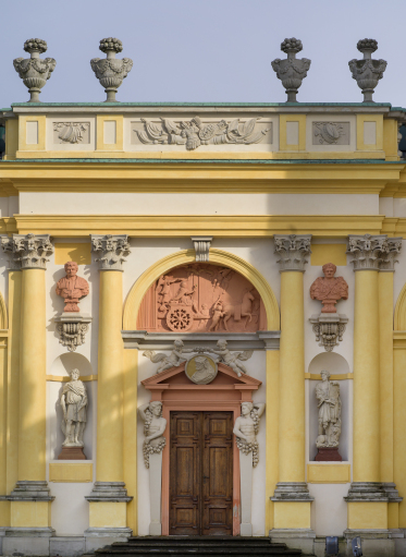Galerie zwieńczone są attyką z rzeźbami. Na ścianach galerii ogrodowych znajdują się symetryczne łuki triumfalne z porfirowymi płaskorzeźbami w kształcie półkola. Prawy, południowy łuk przypisany jest królowi i to jego przymioty wychwala, lewy, północny – królowej. Taka kompozycja odpowiada też układowi pomieszczeń w pałacu.