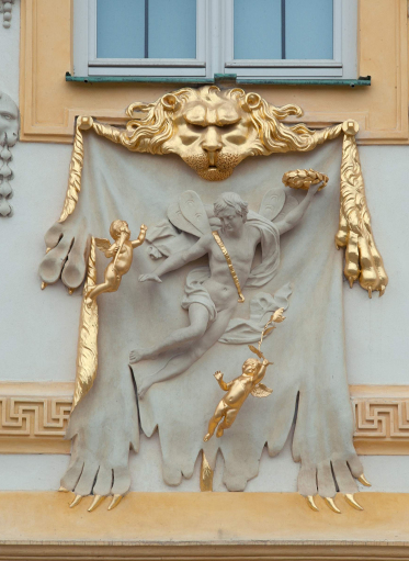 Płaskorzeźby wkomponowano w wystrój elewacji pałacu podczas prac prowadzonych w latach 1681–1682. Autorzy poszczególnych dekoracji nie są znani. Płaskorzeźbę wykonano z masy mineralnej, ma wysokość niecałych 2 metrów i szerokość ponad 3 metrów.